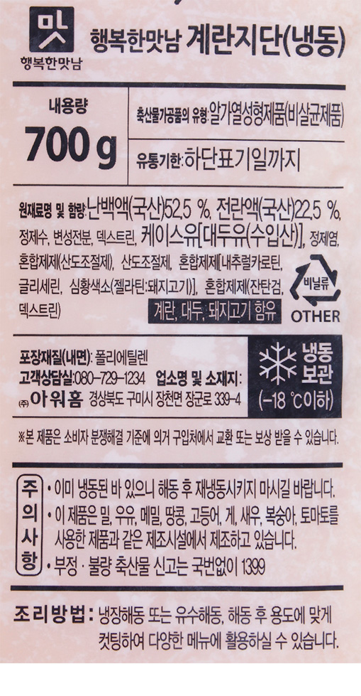 | 품명 및 모델명 | 행복한맛남 계란지단(냉동) |