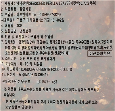 품명 및 모델명 양념깻잎