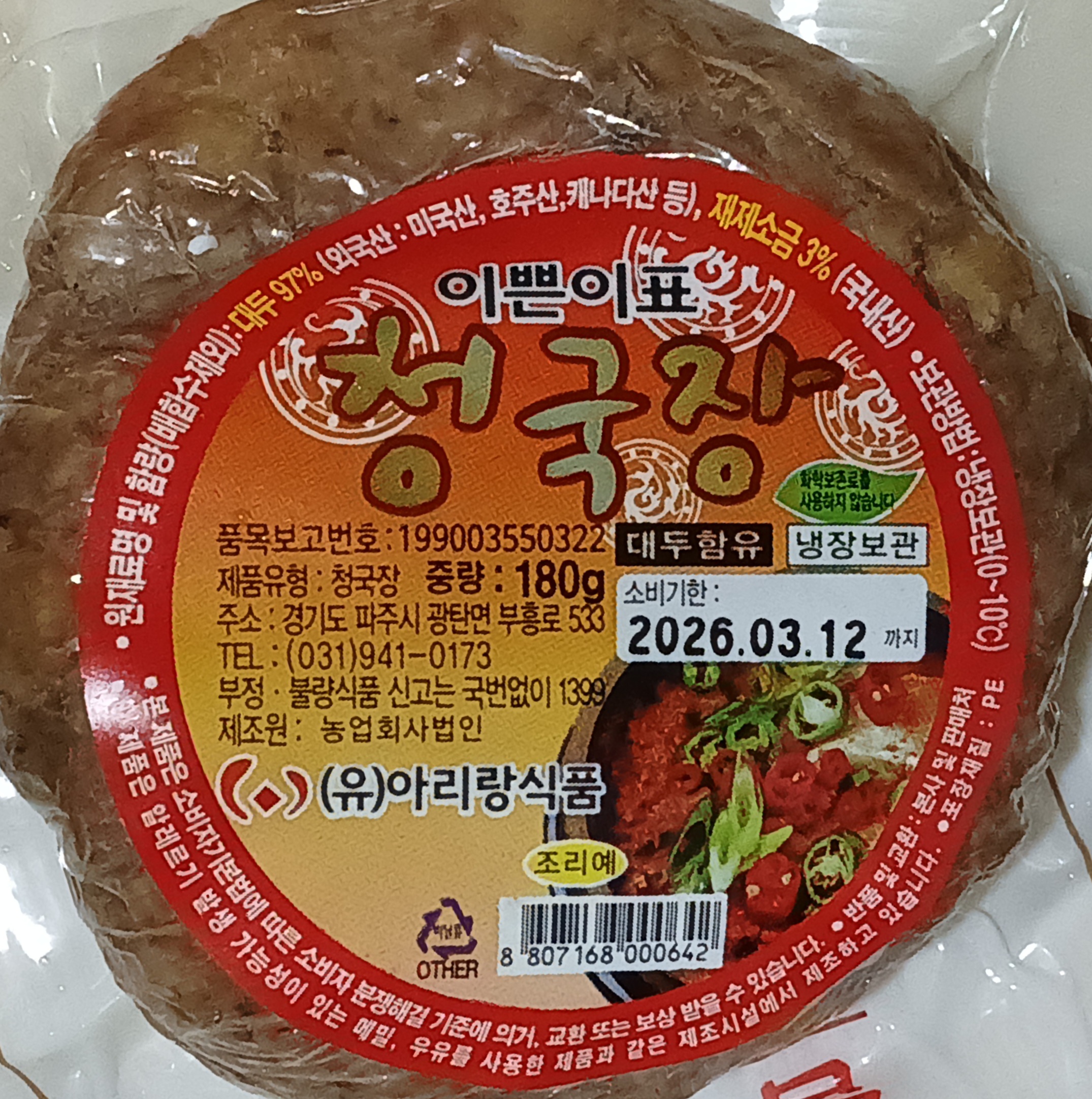 | 품명 및 모델명 | 이쁜이표 청국장 |