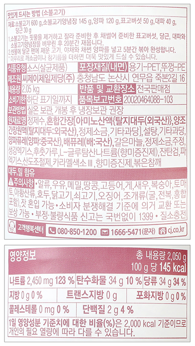 품명 및 모델명 소불고기양념장