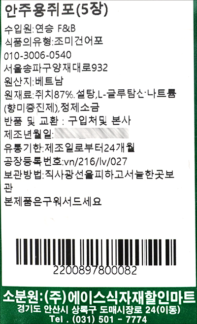 | 품명 및 모델명 | 안주용쥐포 |