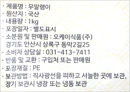 | 포장 단위별 내용물의 용량(중량), 수량, 크기 | 1kg |