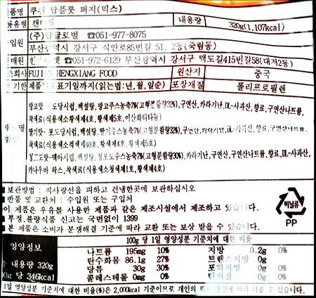 포장 단위별 내용물의 용량(중량), 수량, 크기 320g