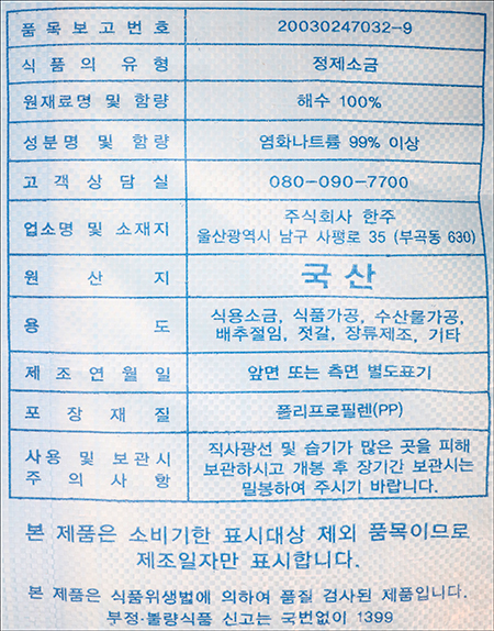| 품명 및 모델명 | 한주소금 |