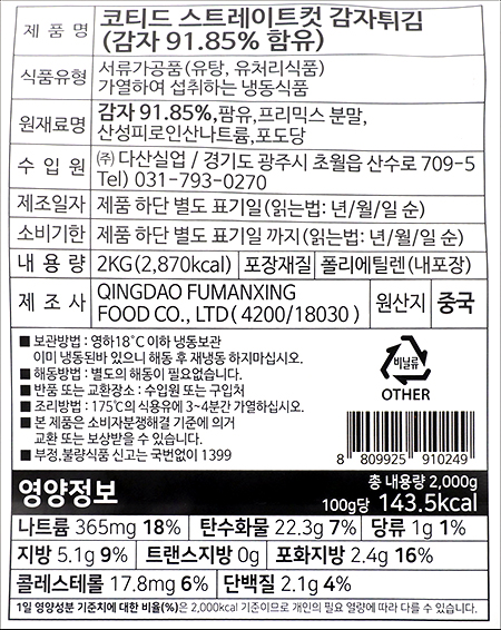 | 품명 및 모델명 | 코티드 스트레이트컷 감자튀김 |