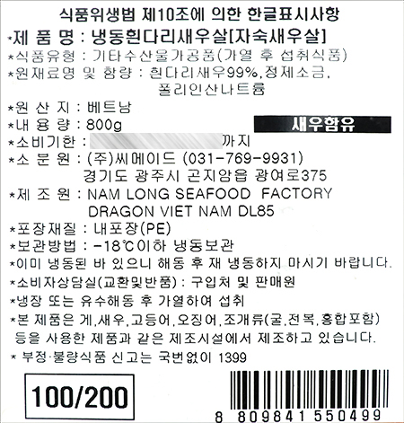 | 품명 및 모델명 | 냉동흰다리새우살[자숙새우살] |