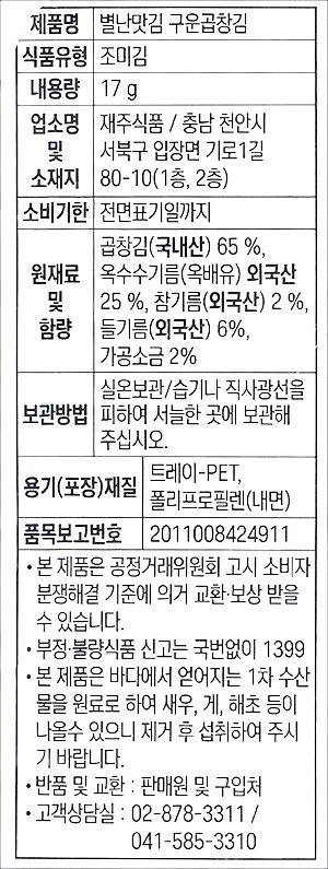| 품명 및 모델명 | 별난맛김 구운곱창김 |