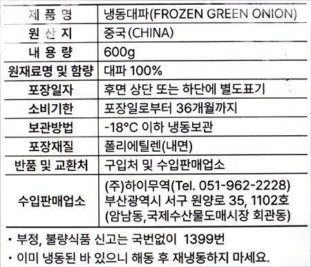 | 품목 또는 명칭 | 냉동대파 |