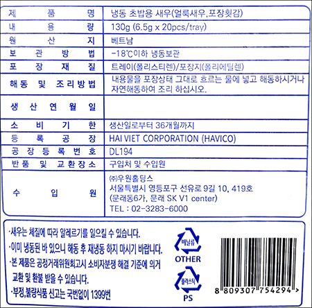 | 품명 및 모델명 | 냉동 초밥용 새우(얼룩새우,포장횟감) |