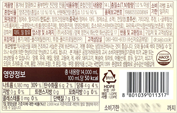 | 포장 단위별 내용물의 용량(중량), 수량, 크기 | 14L |